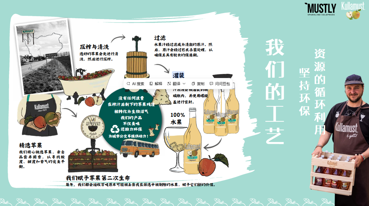 “我们的苹果汁除了新鲜苹果与天然水果,没有任何多余成分。”CARLSSON ROLF PETER 在现场介绍时强调,品牌创新采用 “无氧生产工艺”,通过隔绝氧气防止果汁氧化,不仅保持琥珀色的清透颜值,更完整保留苹果的自然甜润与馥郁果香。此外,生产过程中产生的苹果残渣均转化为生物沼气,为城市公交提供绿色动力,诠释北欧 “零浪费” 的可持续理念。